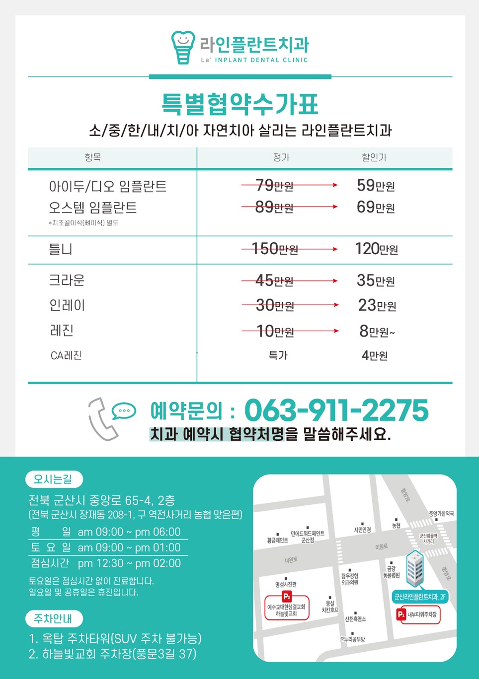 | 89 | 병원 | - | 군산라인플란트치과 | 063-911-2275 | 중앙로 65-4, 2층 | 특별수가표 참고 |