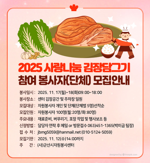 | 69 | [모집완료] 2025 사랑나눔 김장담그기 참여봉사자(단체) 모집 | 센터 김장공장 및 주차장 | 2025-11-03~2025-11-11 |